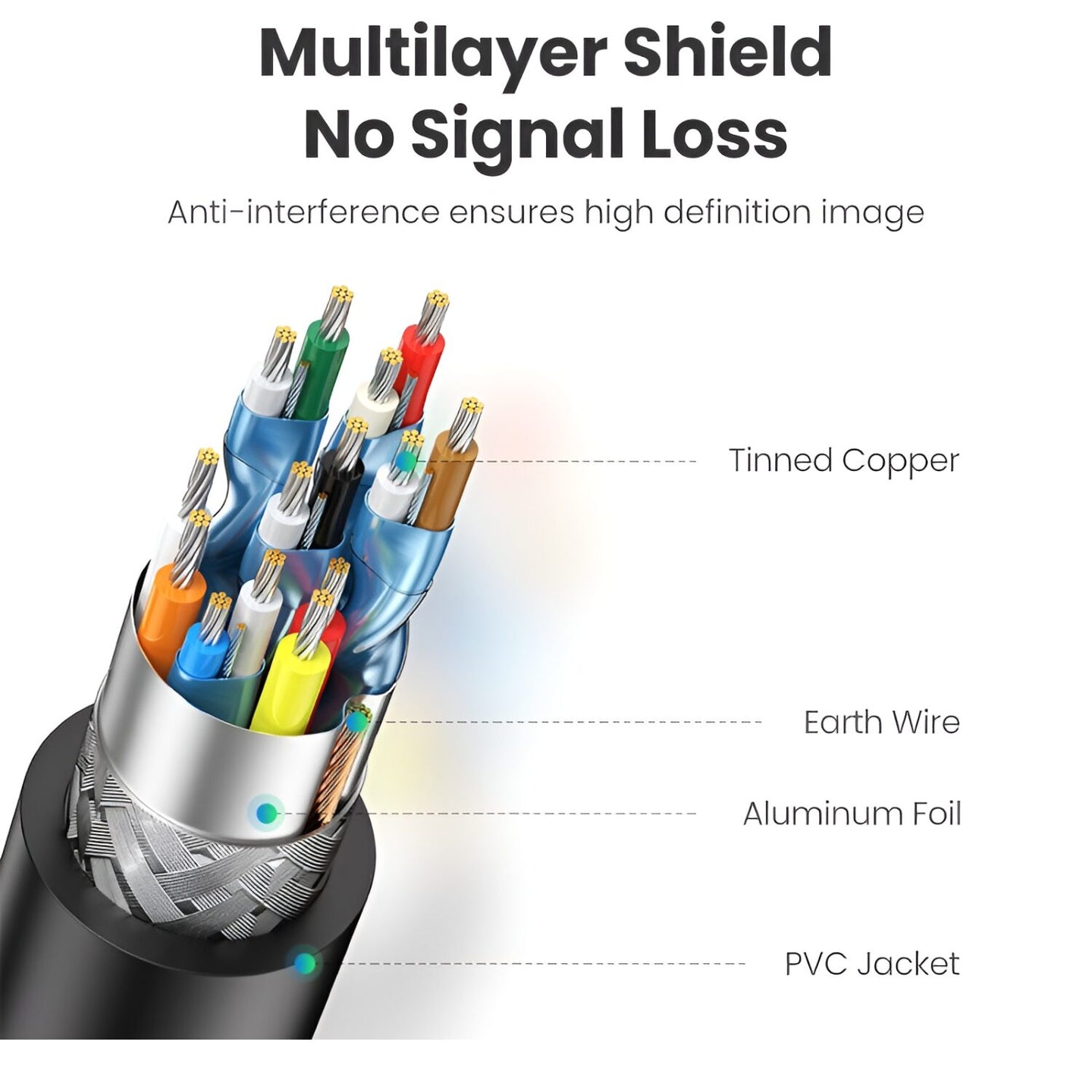 - Triple-layer shielding with ground wire, aluminum foil, and braid to block interference